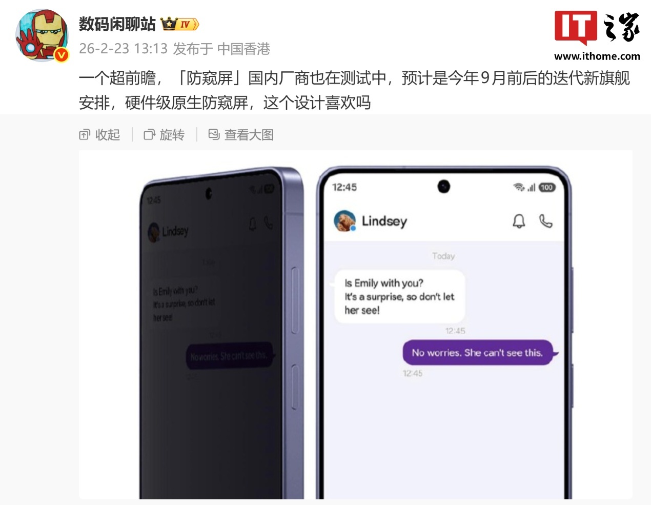 IT之家 2 月 23 日消息,博主 @数码闲聊站 今日“超前瞻”爆料:「防窥屏」国内厂商也在测试中,预计是今年 9 月前后的迭代新旗舰安排。博主强调,这是“硬件级原生防窥屏”。