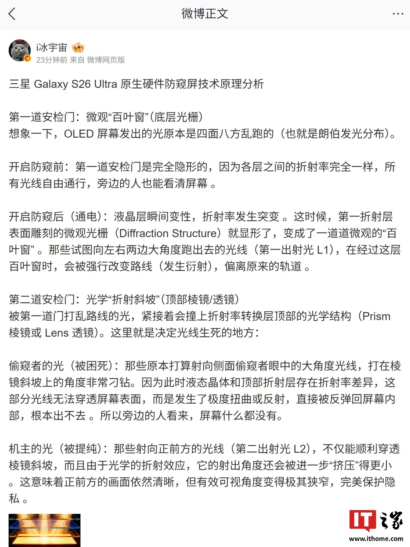 根据博主 @i冰宇宙 分析,该技术拥有两道“安检门”:微观“百叶窗”(底层光栅)和光学“折射斜坡”(顶部棱镜 / 透镜),两者共同作用后,手机就能产生防窥膜的效果,让其他人无法窥探手机的内容。