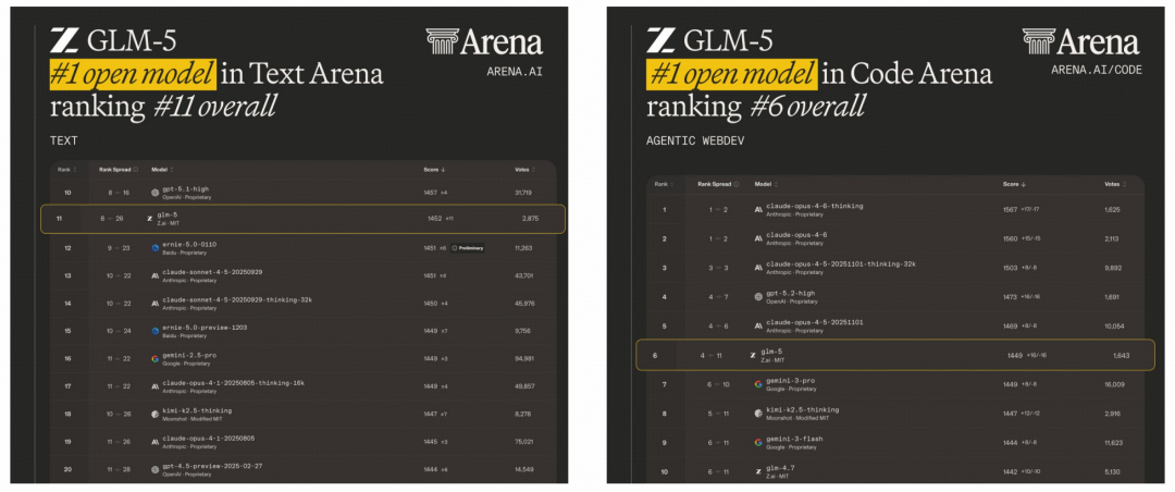 图3:在 LMArena 上,GLM-5 在文本竞技场(Text Arena)和代码竞技场(Code Arena)中均位居开源模型第一。