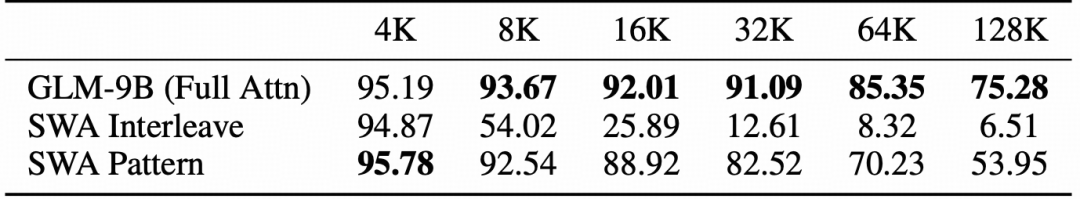 表4:GLM-9B 基线模型及两种 SWA 变体在 RULER 基准测试上的结果(均未经过任何额外训练)。两种 SWA 方法均采用全注意力层与 SWA 层 1:1 的比例,滑动窗口大小为 4096 个 token。基于搜索的 SWA 模式在 16k 上下文长度时发现一次,并统一应用于所有输入长度。