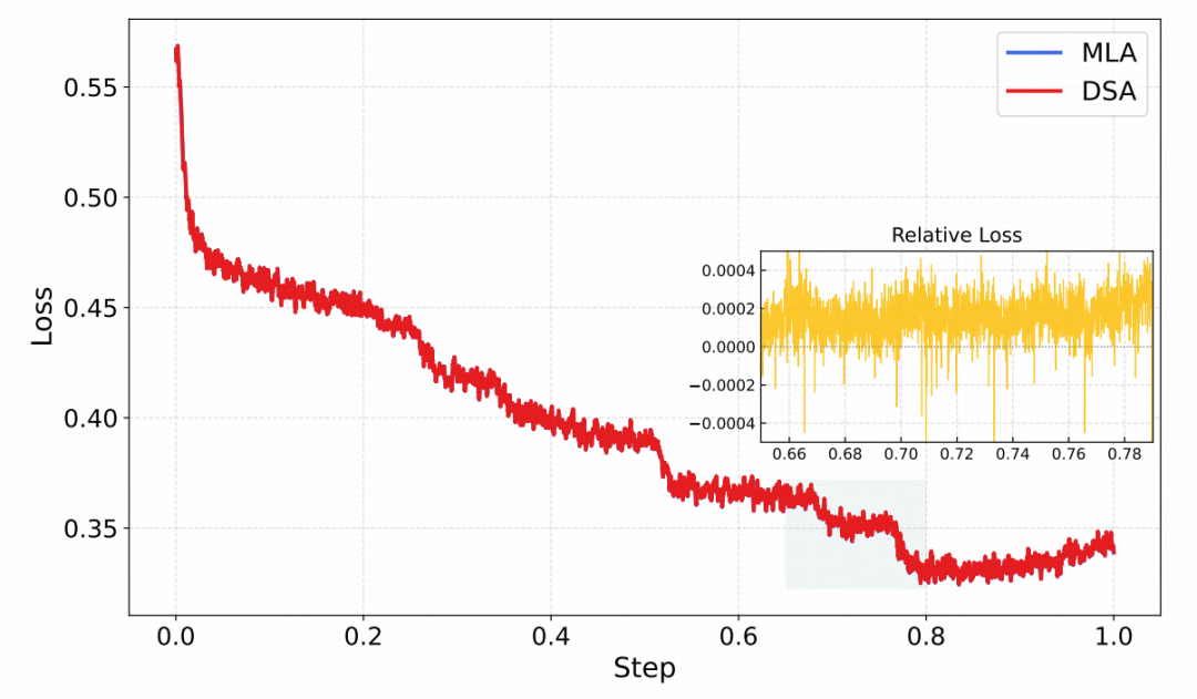 图6:MLA 与 DSA 训练的 SFT 损失曲线对比。结果采用窗口大小为 50 的滑动平均进行平滑处理。