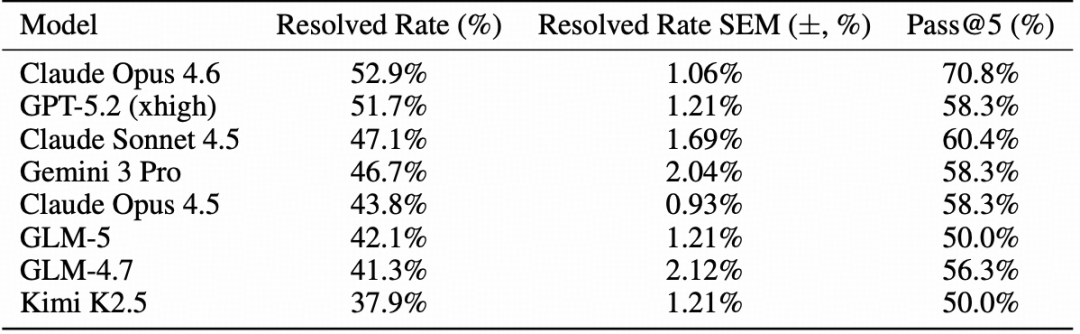 我们在 SWE-rebench 上进行评估,因为 SWE-bench Verified 是一个静态、公开、人工验证的测试集,发布已超过 2 年。相比之下,SWE-rebench 基于自动化流程,持续挖掘新鲜的、真实的 GitHub issue 修复任务,实现去污染(decontaminated)、对时间鲁棒(time-robust)的评估,更好地衡量对新软件工程问题的泛化能力,而非对静态基准的记忆表现。表 9 展示了 GLM-5 在 SWE-rebench 上的官方性能,表明 GLM-5 能够有效泛化到新的 SWE 问题。