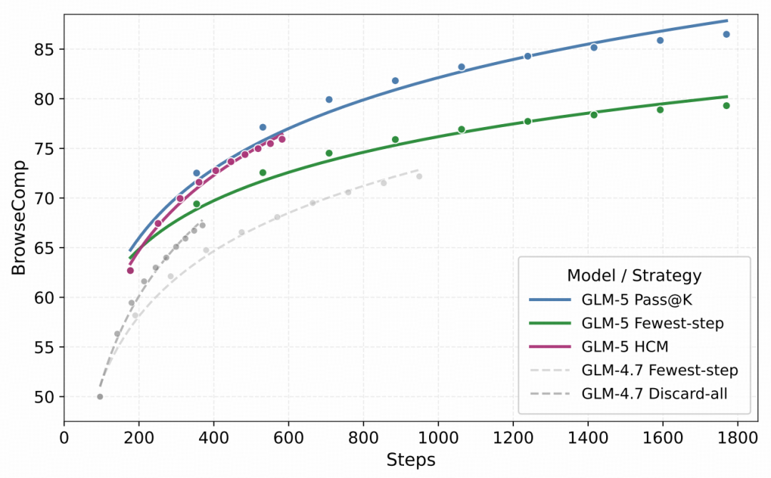 我们发现 BrowseComp 上的性能对裁判提示和裁判模型均敏感,开源模型作为裁判可能引入系统性偏差。为确保一致性和可重现性,我们判定答案正确性采用官方 OpenAI 评估提示和闭源模型 o3-mini 作为组件。先前工作引入了上下文管理,其中 Discard-all 策略通过删除整个工具调用历史来重置上下文。我们进一步观察到,在极长上下文(如超过 100K token)下,模型性能会显著下降。受此启发,我们采用简单的“Keep-recent-k”策略:当交互历史超过阈值 k 时,最近 k 轮之前的工具内容将被折叠以控制上下文长度,我们设定 k=5,从而将 GLM-5 从 55.3%(不含保留最近 k 轮)稳定提升至 62.0%(含保留最近 k 轮)。