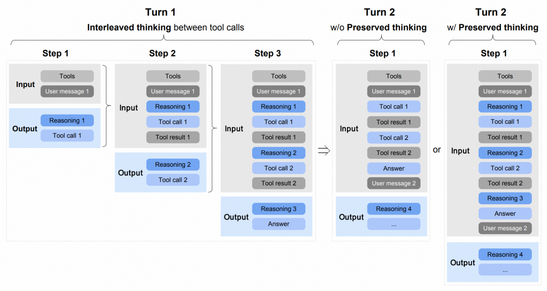 保留思考(reserved Thinking):在 Coding Agent 场景中,模型自动在多轮对话中保留所有思考块,复用已有推理而非重新推导,从而减少信息丢失和不一致性,适合长程复杂任务;