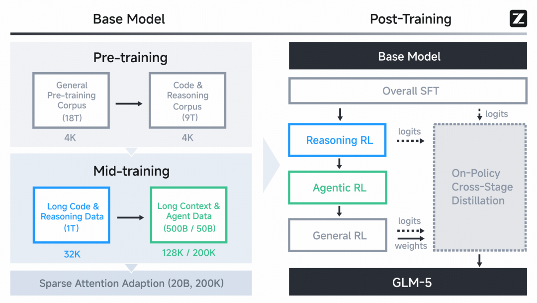 图 5 详细展示了 GLM-5 的整体训练流程。在基础模型训练阶段,我们使用了规模达 27 万亿 token 的海量语料库,并在训练初期重点引入代码与推理数据。随后进入中期训练(Mid-training)阶段,我们将上下文窗口从 4K 逐步扩展至 200K,并专门针对长上下文 Agent 数据进行训练,以保障模型在复杂工作流中的执行稳定性。在后训练(Post-training)阶段,我们引入了一套序列化的强化学习(RL)流程:依次在推理、智能体、通用领域进行强化学习。值得注意的是,我们在全流程中应用了跨阶段在线蒸馏(Cross-stage online distillation)技术,有效克服了灾难性遗忘问题。
