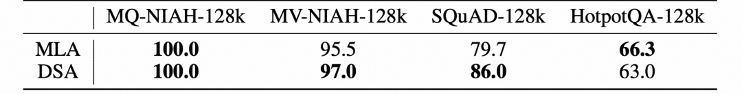 表3:MLA 与 DSA 基础模型在长上下文基准测试上的对比。