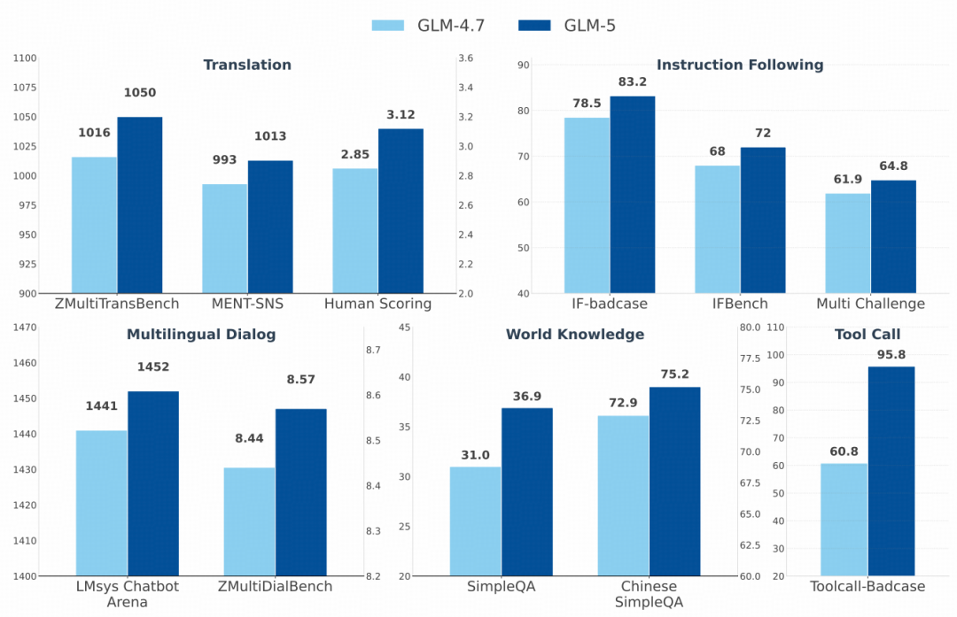 图 11 展示了 GLM-5 与 GLM-4.7 在上述五类真实世界能力上的对比结果。GLM-5 在所有评估维度上均取得了一致提升,包括机器翻译、多语言对话、指令遵循、世界知识与工具调用。各能力的详细评估方式与数据集说明如下: