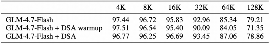 表6:GLM-4.7-Flash 搭配 DSA 的 RULER 基准测试结果。仅预热变体(warmup-only)只训练索引器而保持基础模型冻结,完整 DSA 变体则对两者进行联合训练,共训练 150B token。