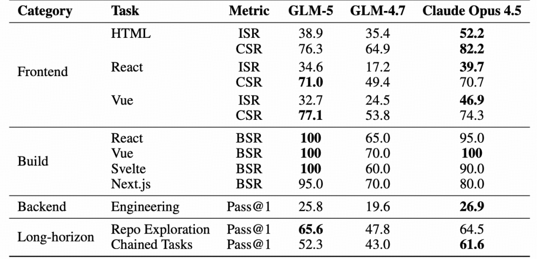 为验证可靠性,我们从两个维度将 Agent-as-a-Judge 评分与独立人类专家判断进行对比:在逐点一致性(point-wise consistency)方面,抽样 130 个检查项,由人类专家独立评分,与 Judge Agent 结果有 94% 一致性,分歧集中在主观视觉质量标准而非功能正确性;在排名一致性(ranking consistency)方面,对 8 个前沿模型(如 Claude Sonnet 4.5、Claude Opus 4.5、Gemini 3 Pro、GLM-4.7、DeepSeek-V3.2 等)同时采用自动框架评估和人类专家评估,得到的模型排名的 Spearman 相关系数为 85.7%,表明强正相关。如表 8 所示,GLM-5 的平均 BSR 达到 98.0% ,在 CSR 上与 Claude Opus 4.5 相比具备竞争力,但在三种技术栈中均存在明显的 ISR 差距,说明 GLM-5 在端到端任务完成度上和 Claude Opus 4.5 相比还有提升空间。