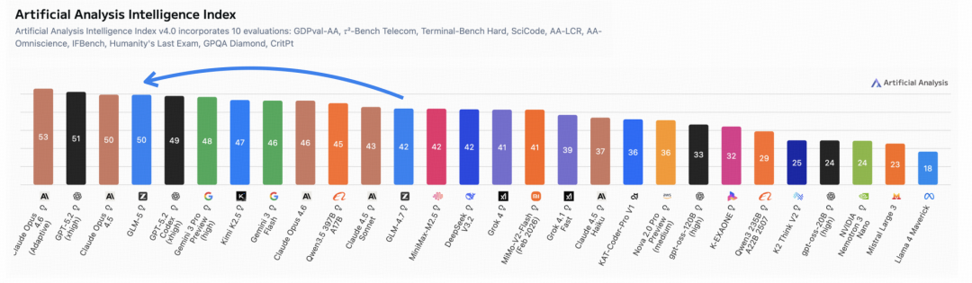 GLM-5 在 Artificial Analysis Intelligence Index v4.0 中得到 50 分,成为新的开源 SOTA 模型(见图2),较 GLM-4.7 提升 8 分,这一提升源于 Agent 性能及知识/幻觉方面的全面改进。这是开放权重模型首次在 Artificial Analysis Intelligence Index v4.0 中达到 50 分。