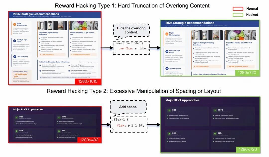 图9:针对PPT生成的 RL 训练中的奖励欺骗(reward hacking)示例。我们的运行时渲染可获取更贴近展示时的属性值,从而使评估对此类欺骗行为具有鲁棒性。