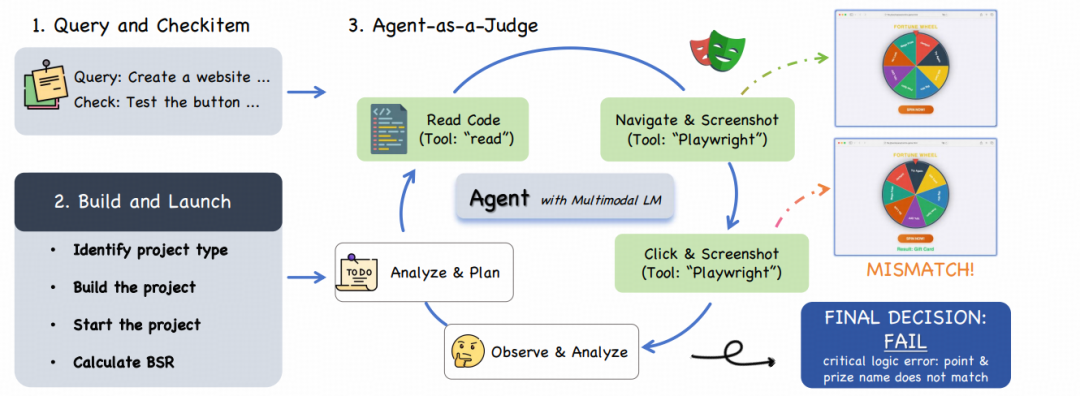 图10:Agent-as-a-Judge 评估流程。每个生成的前端项目首先经过构建以验证静态正确性,构建成功的实例随后由 Judge Agent 进行交互式测试,以判断每个检查项的功能正确性。