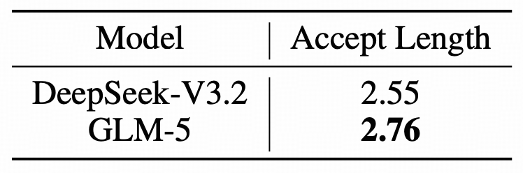 表2:DeepSeek-V3.2 与 GLM-5 接受长度的对比。