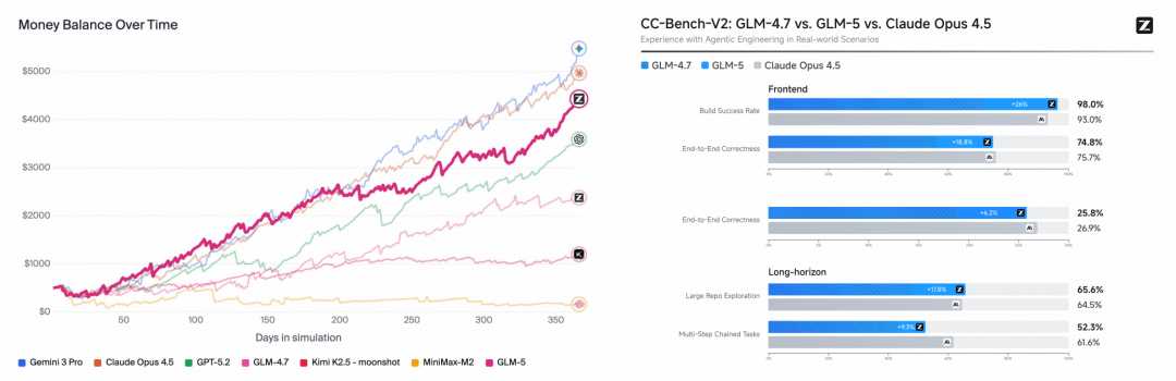 智能体(Agent)在长周期任务中的连贯性正变得愈发关键。如今,编程智能体(Coding Agent)已能连续数小时自主编写代码,AI 模型的任务能力边界也在不断拓展。为了评估 GLM-5 处理长程任务的能力,我们引入了 Vending-Bench 2 和 CC-Bench-V2 两大基准测试。
