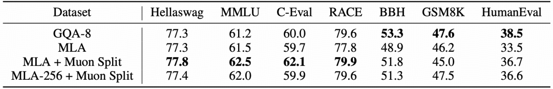 表1:在 GQA-8 和 MLA 等各变体上的评估结果。