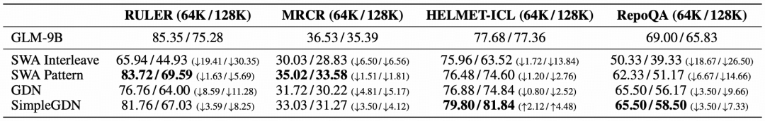 表5:长上下文基准测试结果。所有高效注意力变体均从 GLM-9B 全注意力基线模型进行继续训练。SWA pattern 表示基于搜索的层选择方式;SWA interleave 表示固定交替模式。∆@64K 和 ∆@128K 分别表示在 64K 和 128K 上下文长度下相对于全注意力基线的差值。