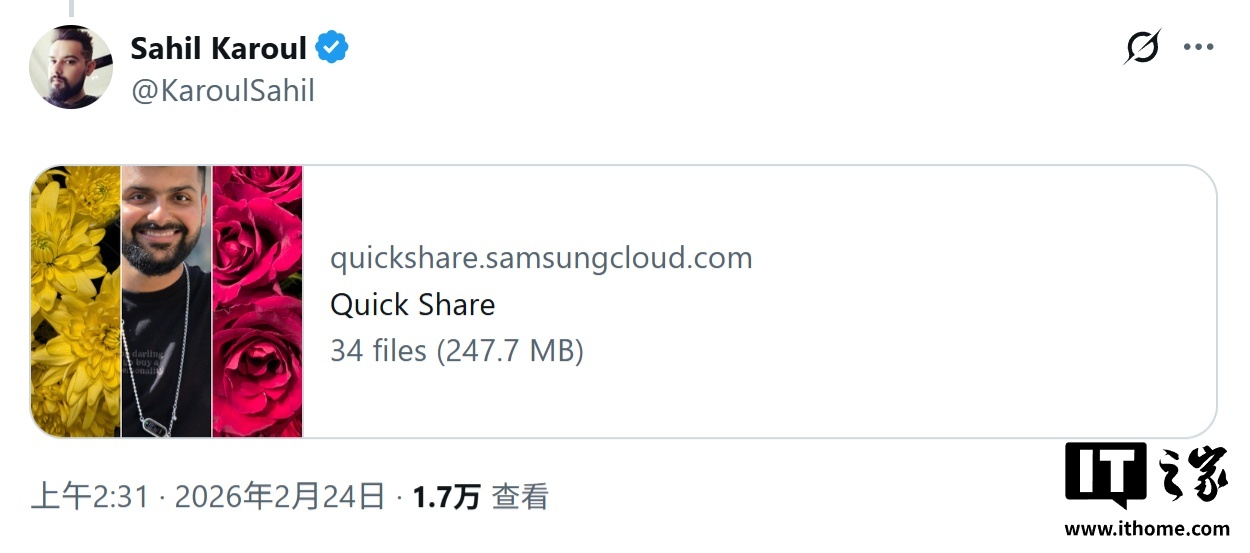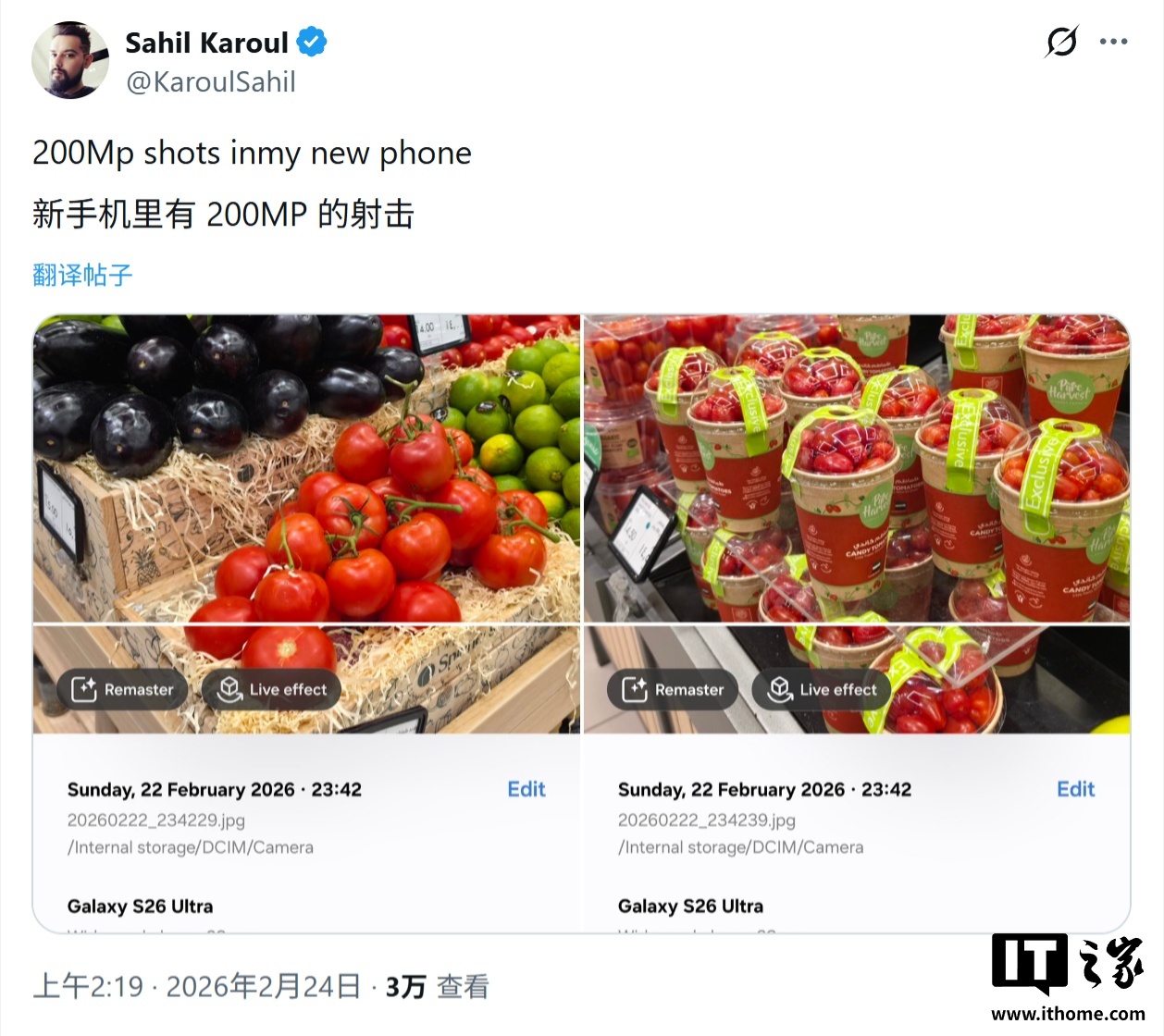 IT之家 2 月 24 日消息,消息源 Sahil Karoul 今天(2 月 24 日)在 X 平台发布推文,分享了一组三星 Galaxy S26 Ultra 手机的拍摄样张。文件共包含 34 个文件,大小为 247.7MB,IT之家发稿前,相关链接已被阻止分享。