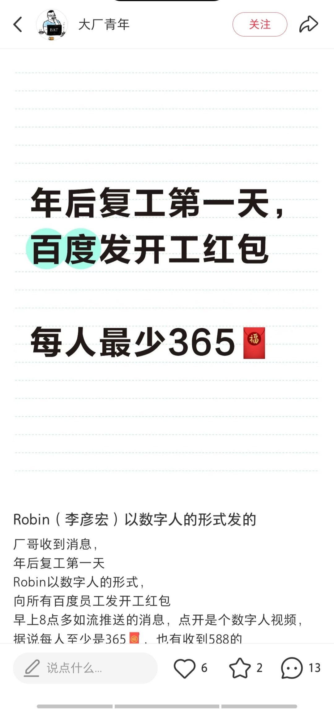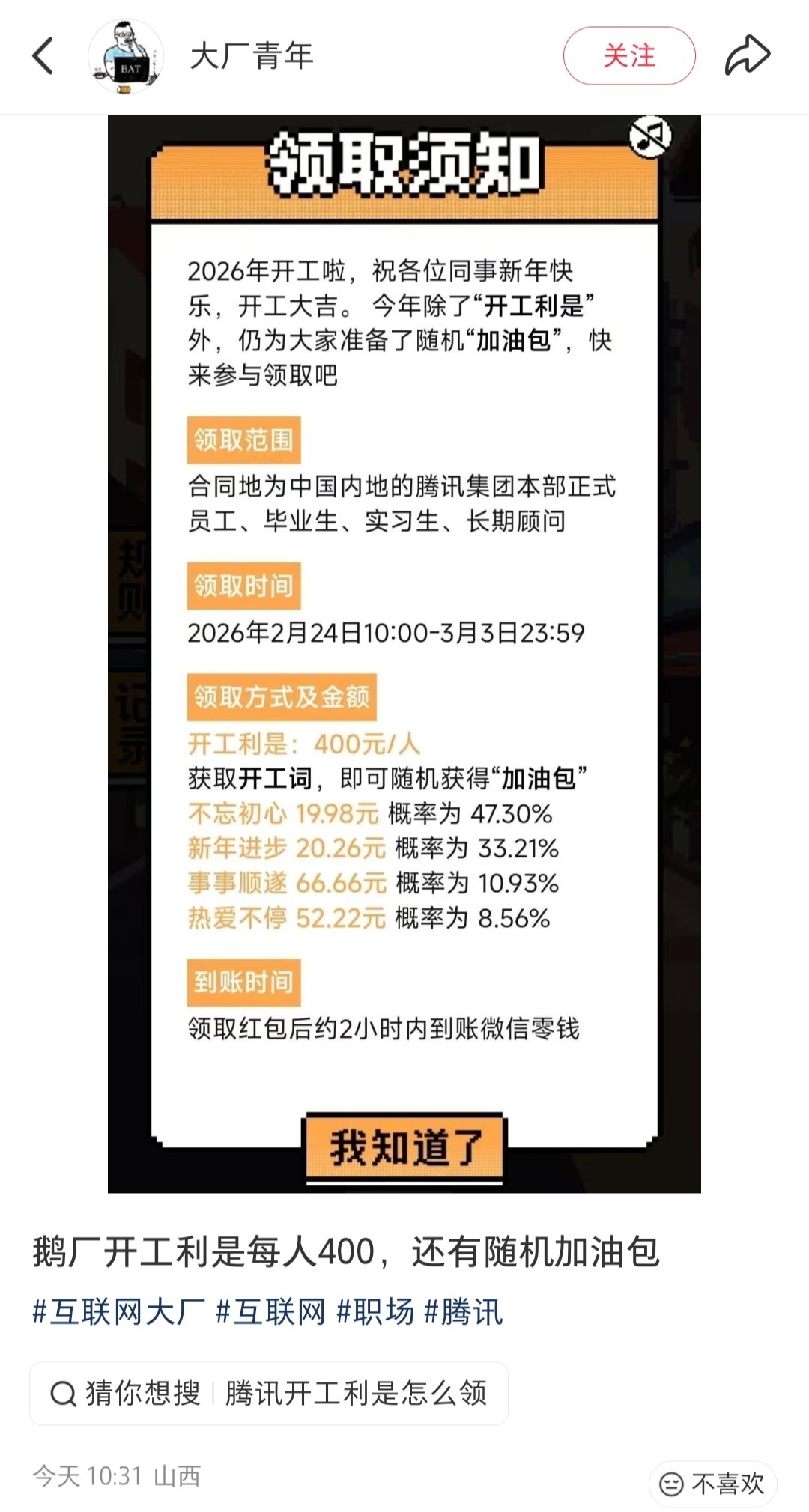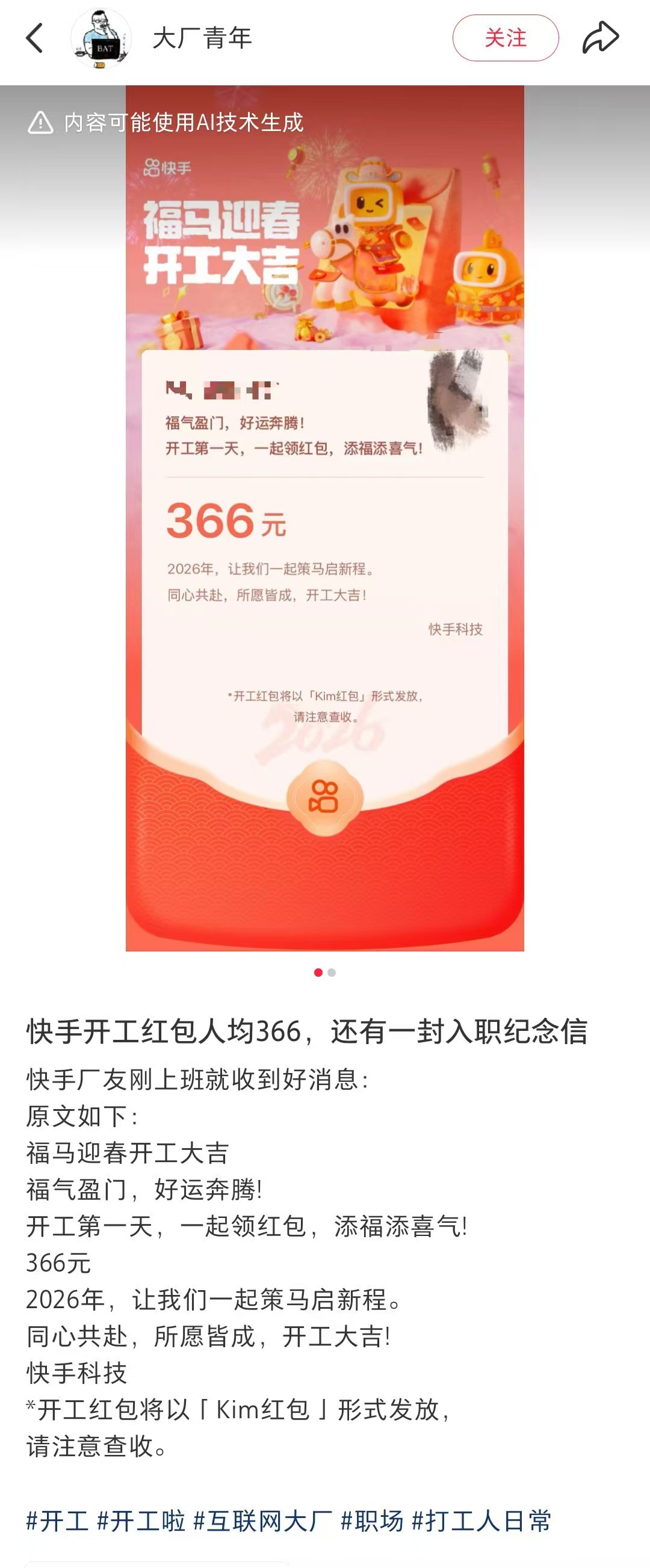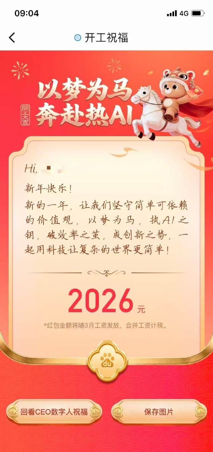 腾讯、快手、百度等多家大厂发开工红包 有人收到2026元 凤凰网科技讯 2月24日,据“大厂青年”爆料,李彦宏以数字人形式向百度员工发开工红包。据说每人至少365元,还有人晒出收到2026元红包的截图。 腾讯今日也发布开工红包,每人400 元,还有19.98元~66.66元随机“加油包”。领取范围为合同地为中国内地的腾讯集团本部正式员工、毕业生、实习生和长期顾问。 快手给全员发开工红包,正式员工366元,实习生200元。 此外,小米创办人,董事长兼CEO雷军今日发文,和高管团队一起,给小米同学们发开工红包。 Published by 风君子 独自遨游何稽首 揭天掀地慰生平 View all posts by 风君子