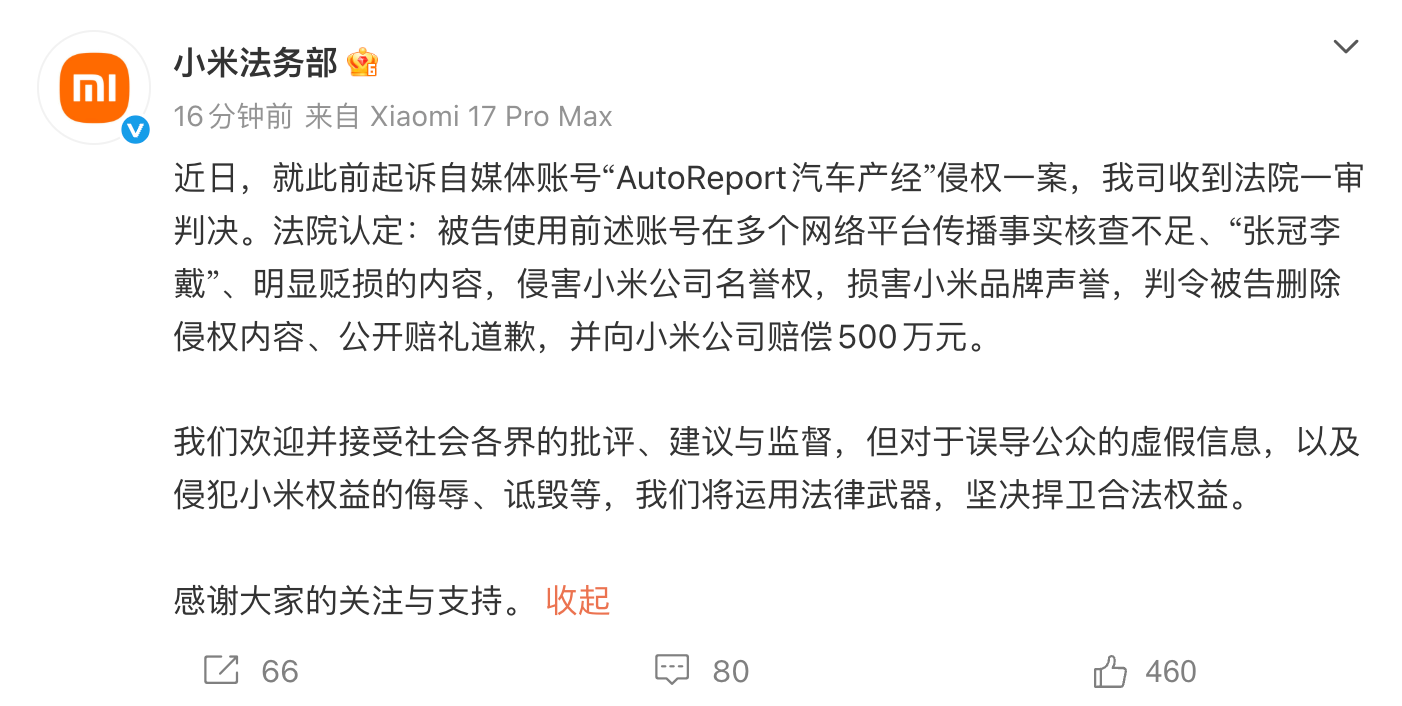 自媒体“AutoReport汽车产经”贬损小米公司 被判赔偿500万元 凤凰网科技讯 2月24日,小米法务部发布公告,起诉自媒体账号“AutoReport汽车产经”侵权一案迎来一审判决。 法院认定:被告使用前述账号在多个网络平台传播事实核查不足、“张冠李戴”、明显贬损的内容,侵害小米公司名誉权,损害小米品牌声誉,判令被告删除侵权内容、公开赔礼道歉,并向小米公司赔偿500万元。 Published by 风君子 独自遨游何稽首 揭天掀地慰生平 View all posts by 风君子