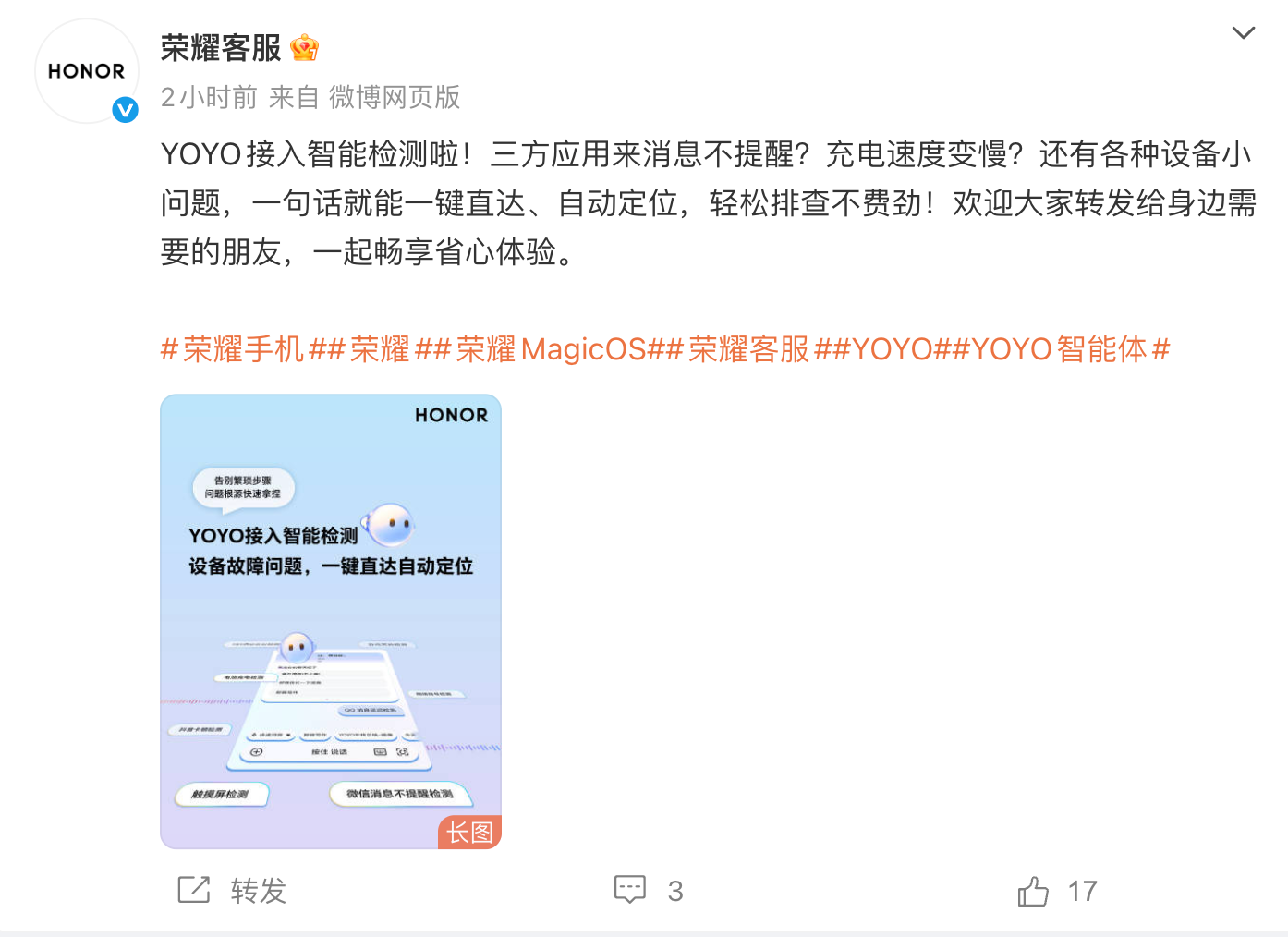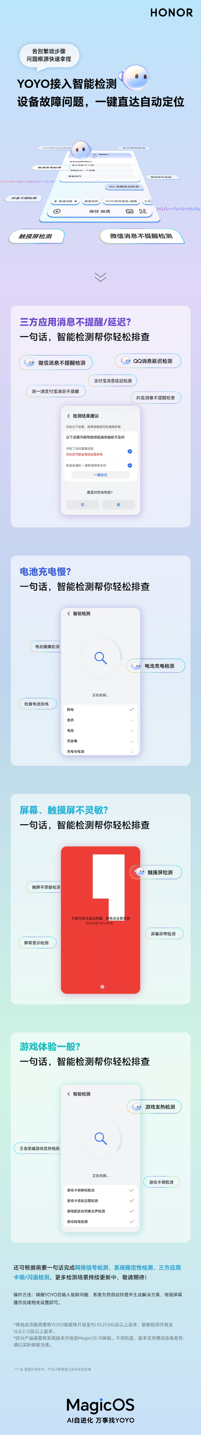 荣耀YOYO助理接入智能检测,支持自动定位、排查设备问题等 凤凰网科技讯 2月24日,荣耀客服官方发文宣布,YOYO助理已接入智能检测。据介绍,用户可通过YOYO助理一句话直达、自动定位,排查各种设备问题等。 从荣耀官方获悉,该功能需要将YOYO智能体升级至90.10.27.040及以上版本;智能检测升级至16.0.2.10及以上版本。 本月早些时候,荣耀还推出MagicOS系统二月新春特别更新,带来了YOYO 24h盯机票低价、YOYO生成专属拜年视频+新年写真、马年专属主题&春节水印等功能。 Published by 风君子 独自遨游何稽首 揭天掀地慰生平 View all posts by 风君子