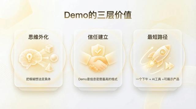 为什么?因为 demo 是信息密度最高的格式:报告会让人睡着、Slides 会让人分心、Demo 让人看到自己眼睛的真实信息…