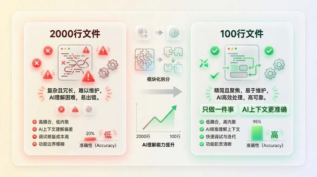 如果一个文件有 2000 行,AI 出错的概率成倍增加。如果一个文件 100 行,只做一件事: