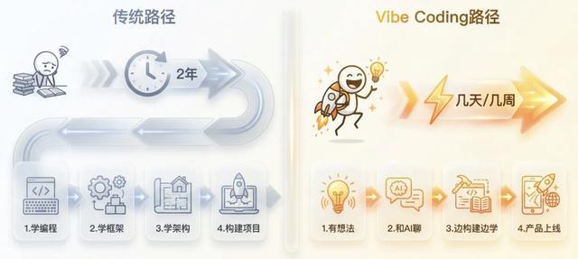 Vibe Coding 的路径完全反过来:你先有一个想做的东西,然后边做边学。遇到不懂的,问 AI;卡住了,让 AI 帮你解决。整个过程可能只需要几天甚至几个小时,你就能做出一个可以用的东西。