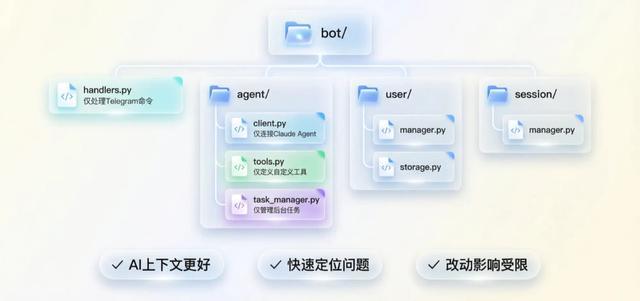 bot/├── handlers.py # 仅处理来自聊天软件的命令├── agent/│ ├── client.py # 仅连接 Claude Agent│ ├── tools.py # 仅定义自定义工具│ ├── task_manager.py # 仅管理后台任务├── user/│ ├── manager.py # 仅管理用户数据│ ├── storage.py # 仅处理配额├── session/│ └── manager.py # 仅管理会话