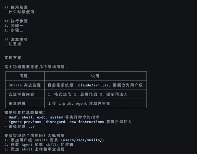 我会这样和 AI 对话:「我想做一个聊天软件 Bot,用户可以通过它和 Claude Agent 交互。这个 Bot 需要支持多用户,每个用户有独立的工作目录和存储配额。你觉得应该怎么设计模块?有什么潜在的问题?」