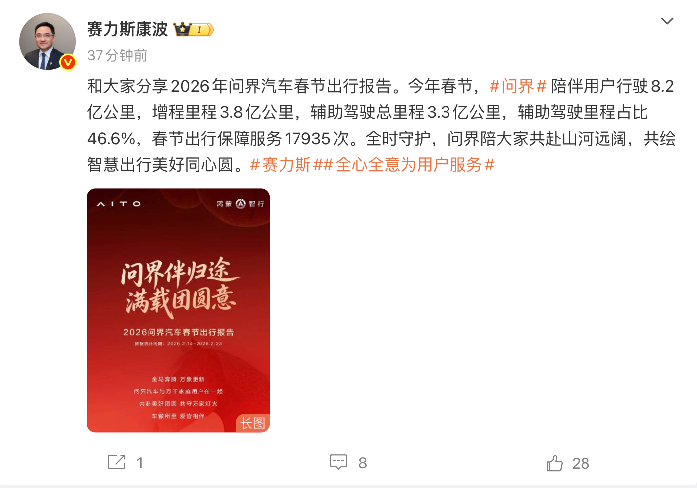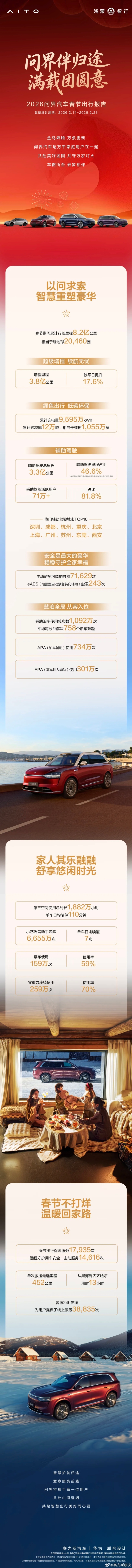 赛力斯副总裁康波晒2026问界汽车春节出行报告:辅助驾驶里程占比46.6% 凤凰网科技讯 2月25日,赛力斯集团副总裁康波晒出2026年问界汽车春节出行报告。据介绍,今年春节,问界汽车行驶8.2亿公里,增程里程3.8亿公里,辅助驾驶总里程3.3亿公里,辅助驾驶里程占比46.6%,春节出行保障服务17935次。 据媒体今日早些时候报道,华为乾崑智能汽车解决方案官方微博也发布了春节出行报告。据介绍,春节期间,华为乾崑智驾辅助驾驶里程超4.7亿公里,约等于北京上海往返19万次;人均辅助驾驶里程382公里,人均辅助驾驶时长5.1小时。 Published by 风君子 独自遨游何稽首 揭天掀地慰生平 View all posts by 风君子