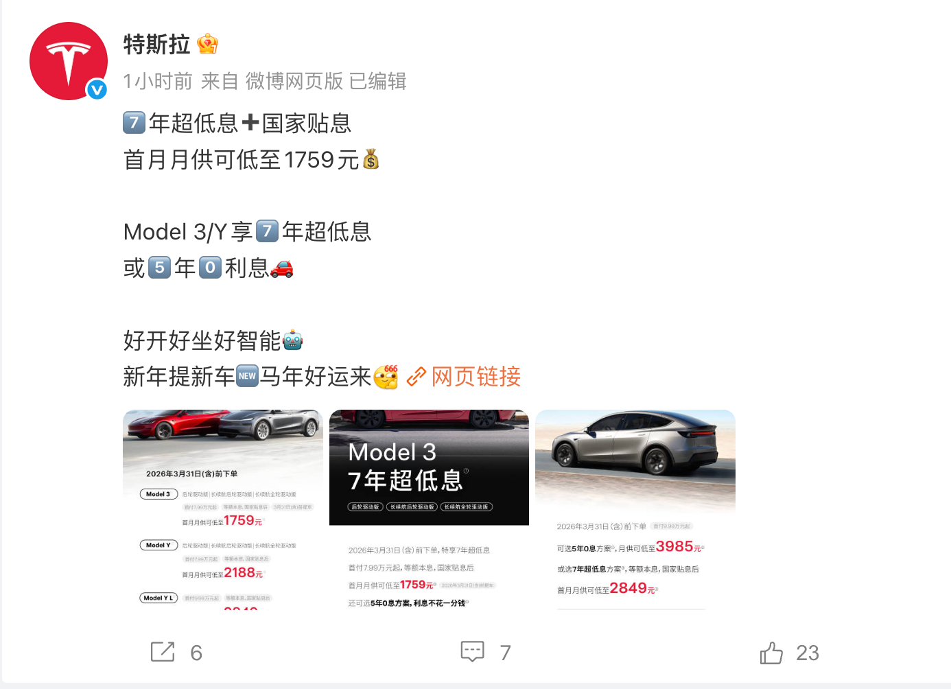 特斯拉中国促销:全系车型5年0息 可选7年超低息 凤凰网科技讯 2月26日,特斯拉中国官宣,在3月31日前下单,全系车型均可享受7年超低息贷款。具体来看,Model 3首付7.99万起,月供可低至1759元;Model Y首付7.99万起,月供可低至2188元;Model Y L首付9.99万起,月供可低至2849元;以上三款车型还均可选择5年0息方案,贷款购车不用任何利息。 值得一提都是,今年1月份特斯拉就推出了类似的购车金融方案,这相当于变相降价,主要目的是为了提振销量。 据媒体不完全统计,自特斯拉率先推出“7年低息”政策后,包括比亚迪,小米、蔚来、吉利等超过10家车企跟进该政策。 Published by 风君子 独自遨游何稽首 揭天掀地慰生平 View all posts by 风君子