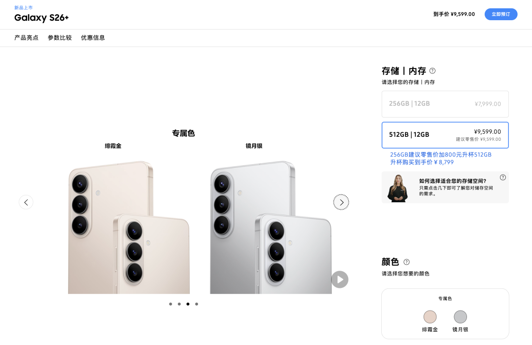 大屏的 S26+ 则有 12+256 和 12+512GB 两种可选,标价分别为 7999 和 9599,曾经的免费升杯也变成了「加 800 元升杯」,512 机型实际到手价为 8799 元: