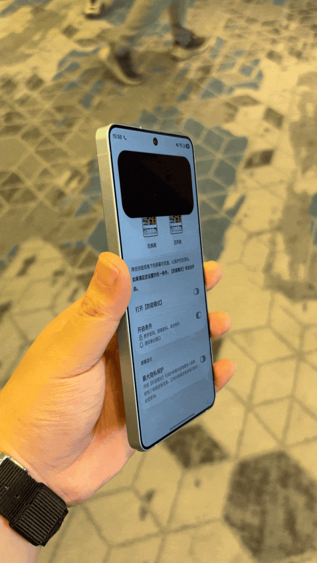 防窥模式还有两档强度可调。打开第二档高强度防窥之后,屏幕基础亮度会略微降低,但侧看过去屏幕会黑得更彻底: