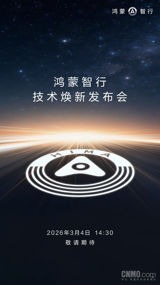 【CNMO科技消息】2月26日,华为终端官方微博正式宣布,鸿蒙智行技术焕新发布会将于3月4日14:30举行,主题为“万象更新,驭见未来”。CNMO猜测,此次发布会预计将带来鸿蒙智行在智能驾驶、智能座舱及全栈技术领域的最新成果,并可能为2026年L3级自动驾驶的规模化商用吹响前奏。