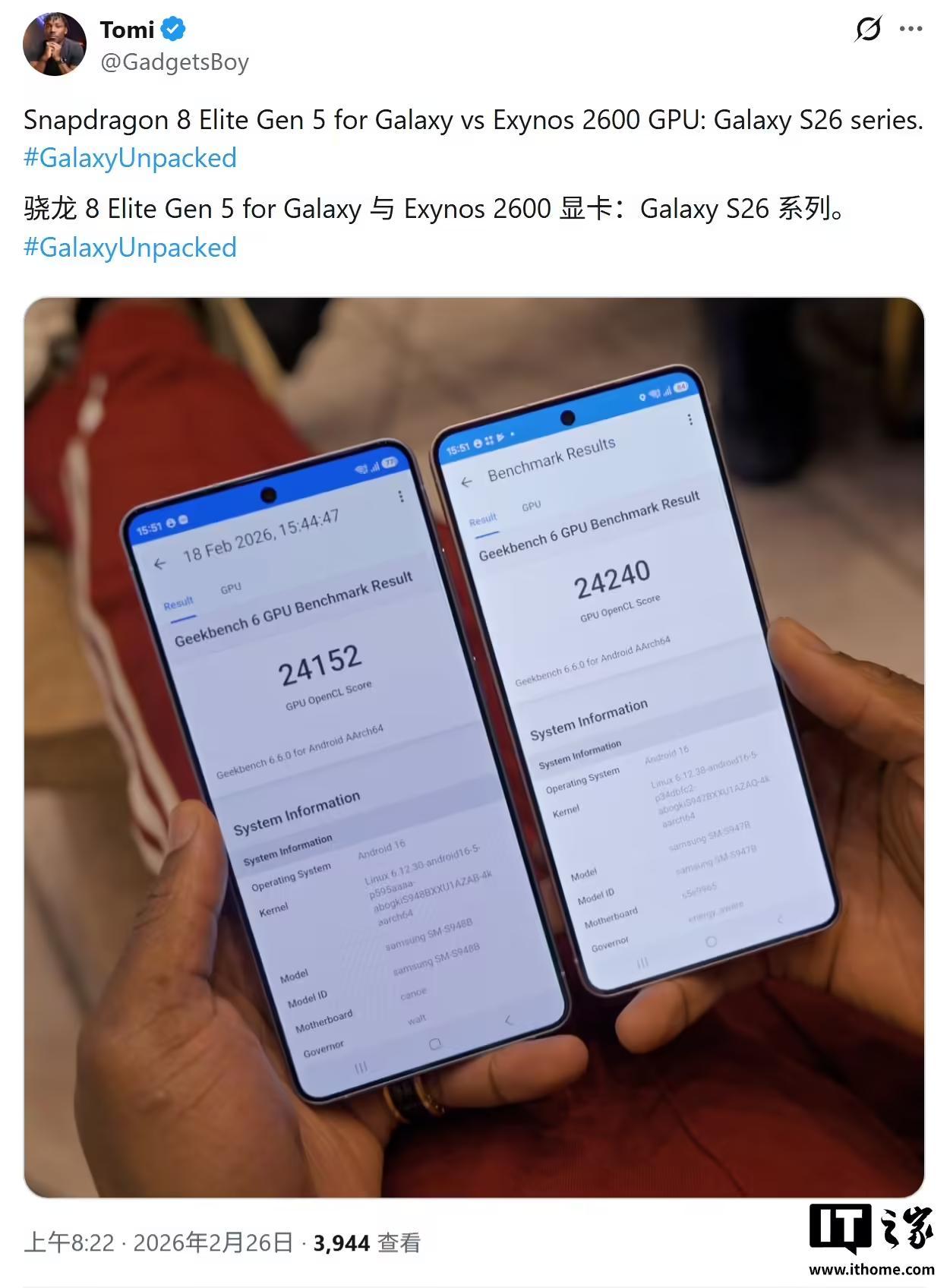 IT之家 2 月 26 日消息,科技博主 @GadgetsBoy 今天(2 月 26 日)在 X 平台发布推文,分享了两张图片,在 Galaxy S26 系列手机上,对比了高通第五代骁龙 8 至尊版 for Galaxy 和三星自研 Exynos 2600 两款芯片。