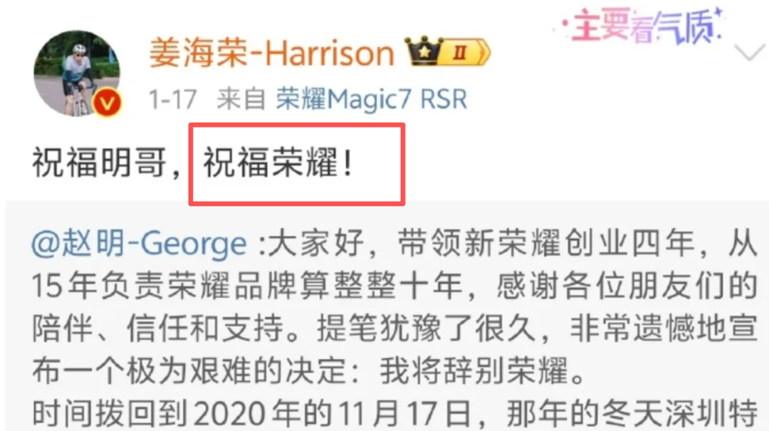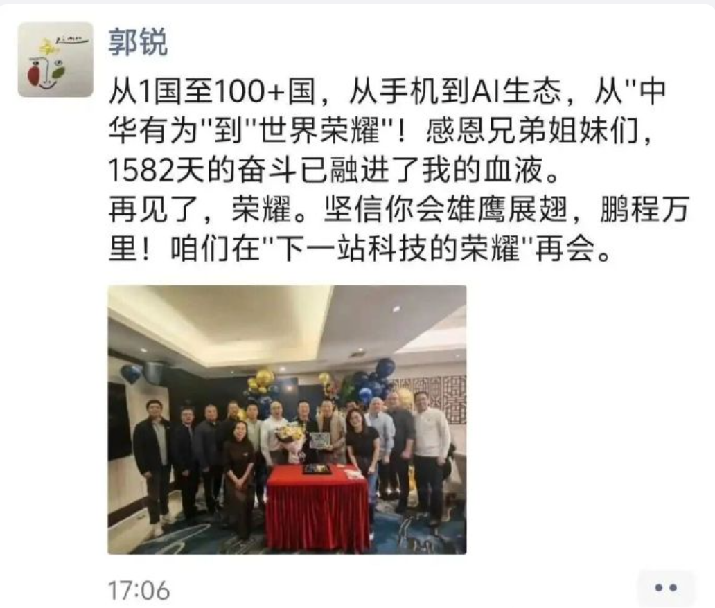 这份总结,源自郭锐2个多月前离职时发的朋友圈。他当时还对荣耀送上了祝福——正如他的前同事、现深蓝汽车CEO姜海荣那样。