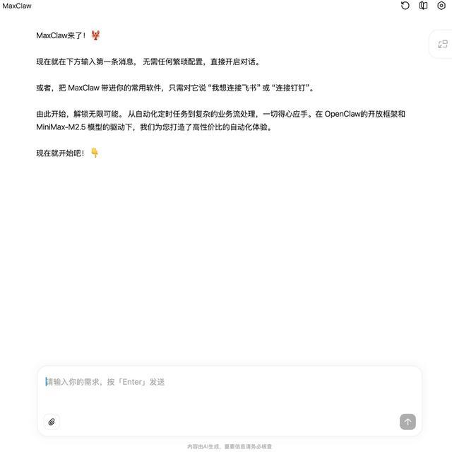 MaxClaw则把这一套流程搬进MiniMax Agent网页端,为每位用户在云端运行一个独立的OpenClaw实例,并接入MiniMax模型。
