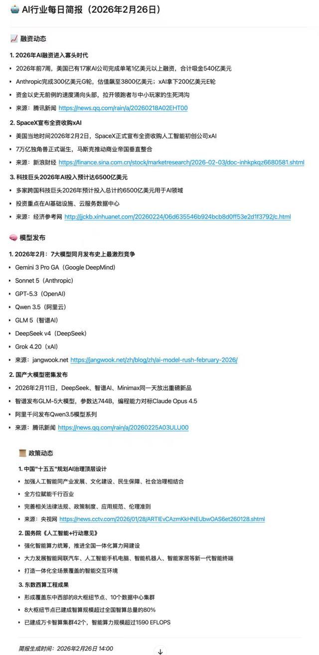 我设定每天14点抓取过去24小时AI行业重大融资、模型发布和政策动态,自动去重后生成一份中文摘要并附来源链接。任务通过Cron表达式实现自动化执行。