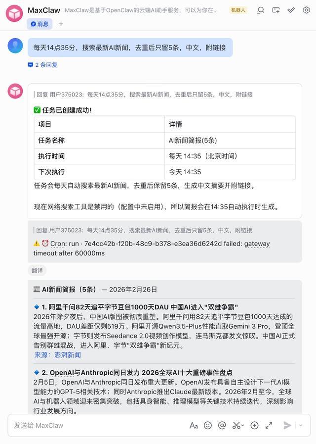接入完成后,我在对话框里输入:“每天14点35分,搜索最新AI新闻,去重后只留5条,中文,附链接。”MaxClaw立即回应了该信息,并留下了一个“敲键盘”的状态。