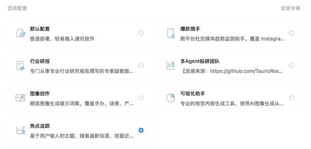 在实际体验中,我围绕一个更贴近媒体场景的需求进行了测试:创建一个“跨平台AI产业趋势研究专家”,要求具备数据抓取、新闻来源交叉验证、结构化报告生成能力,同时输出适合公众号长文的结构框架与可视化图表建议。