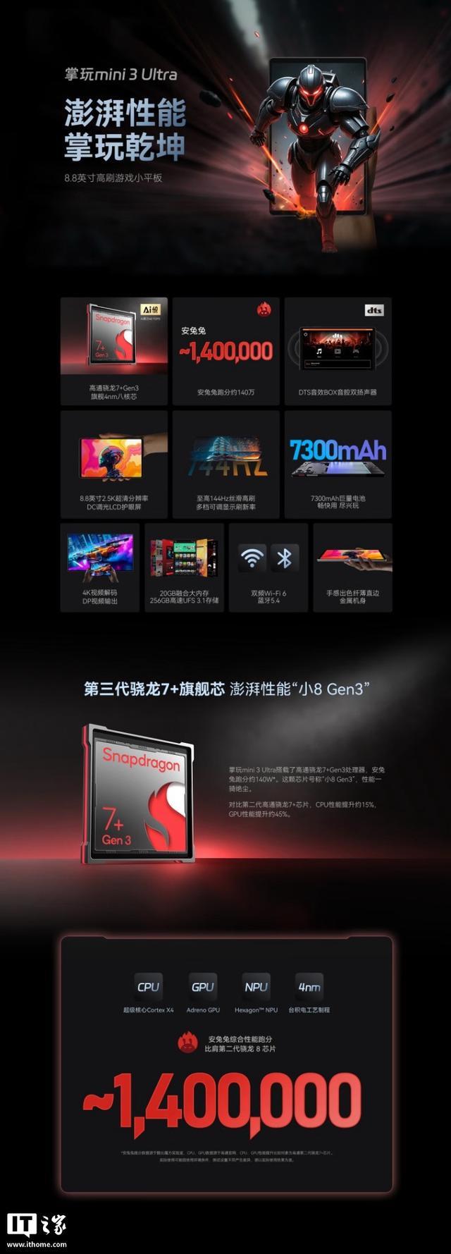 作为比较,酷比魔方现款掌玩 mini 3 Ultra 平板电脑使用高通骁龙 7+ Gen 3 处理器,匹配 12GB RAM 和 256GB 存储空间,配备 7300 毫安时电池(支持 18W 充电),上市价格为 1699 元。