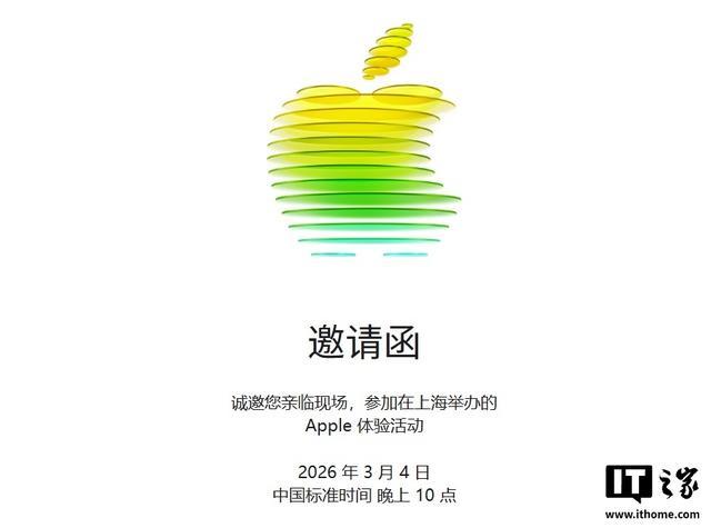 此前,苹果公司宣布将于 3 月 4 日晚上 10 点在上海举行 Apple 体验活动,IT之家已收到苹果发送的邀请函。
