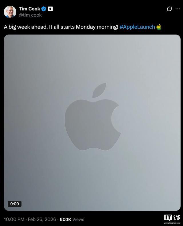 原标题:库克在X平台暗示苹果将从3月2日起陆续推出新品,预计为平价MacBook/iPhone 17e等