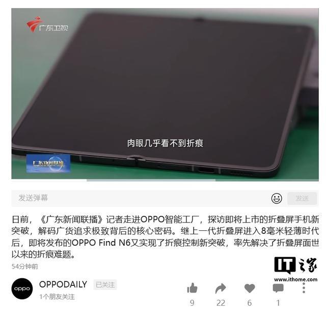 另据 OPPO 官方 2 月 26 日公布消息,《广东新闻联播》日前走进 OPPO 手机生产一线,探访即将上市的 OPPO Find N6 折叠屏手机。