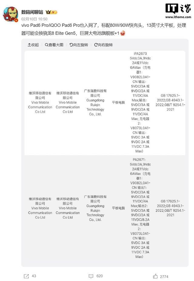 IT之家查询发现,vivo 本月入网了两款平板电脑,@数码闲聊站 称新品分别为 vivo Pad6 Pro 和 iQOO Pad6 Pro,标配 80W/90W 快充头,13 英寸大平板,处理器可能会换骁龙 8 Elite Gen5,巨屏大电池旗舰板 +1。
