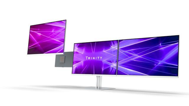 作为显示器厂商推出的三屏解决方案,AOC Trinity 可谓是相当优雅:其仅需一个显示器支架即可固定三块屏幕,大幅缩减了桌面占用空间。同时该设计的左右两侧面板支持 30° 倾斜,快拆结构则意味着两侧可独立作为便携屏使用。