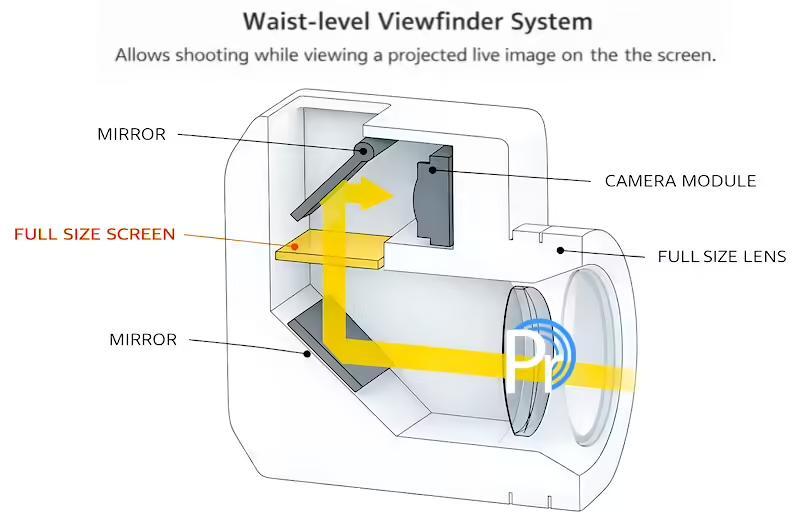 值得注意的是,佳能并没有采用纯数码滤镜的方式呈现复古照片质感。而是为这套相机配备了一套较为复杂的光学系统,具体来说,光线首先会通过镜头进入机身,经两面反射镜重新引导:第一面镜子将光线反射向上;第二面镜子则将光线投射到腰平取景器。