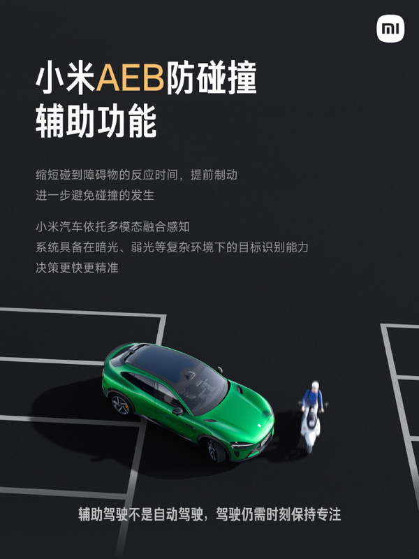据小米汽车方面介绍,AEB(自动紧急制动)辅助功能主要作用于缩短系统对障碍物的反应时间,通过提前制动来降低碰撞风险。该功能依托多模态融合感知技术,能够在暗光、弱光等复杂环境下对目标进行识别,提升决策速度和精准度。
