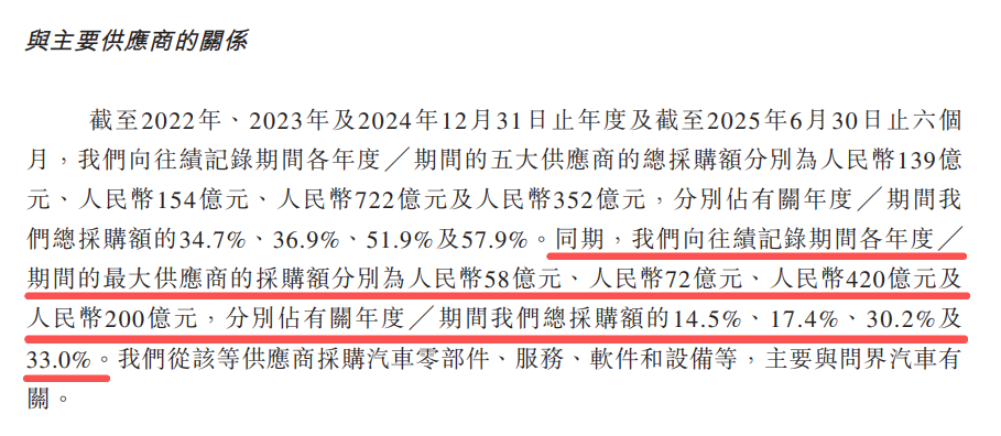 赛力斯在招股书里就说了,华为长期以来都是它的最大供应商,从 2022 年到 2025 上半年,赛力斯对华为的采用费用逐年递增,分别是 58 亿、72 亿、420 亿和 200 亿,加起来到达恐怖的 750 亿。