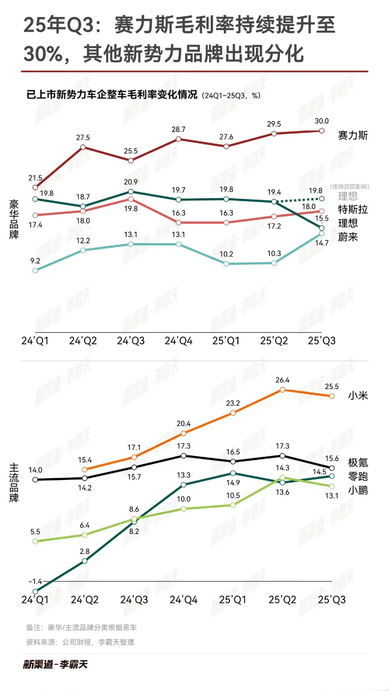 要知道,目前大多数新势力品牌的毛利率,都在 10-20% 之间,比如特斯拉是 18%,理想在 20% 左右,蔚来则只有 14.7% ,和它们比,赛力斯不知不觉就活成了各家车企梦中的样子。